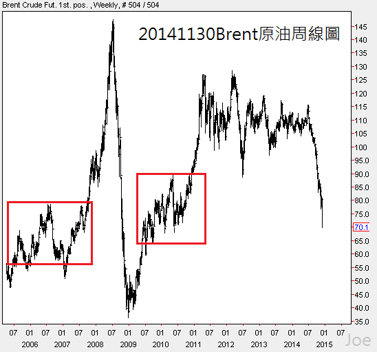 國際油價近期相當弱勢,Brent原油已經跌到2010年的盤整下緣,甚至回到2006年的起漲位置,北美WTI原油價位更低