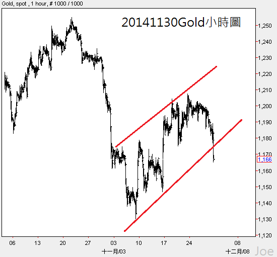 延續先前分析,黃金上週在US$1180~1200這個壓力區盤整一段時間後,局勢並沒有上攻好轉,這次收周線連短線盤整下緣都跌破,短線反彈隨時會結束,在強勢美元的力道下,後續黃金持續走跌的機率頗高 |