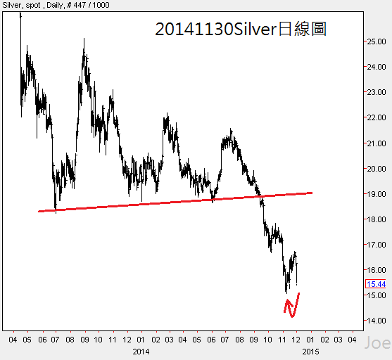 白銀價位跌破紅線以後,行情持續維持弱勢,目前全球通貨膨脹預期偏低,國際能源價格也維持弱勢,白銀後續走跌機率相當高,我認為US$15.00也會摜破,美元升息以前,向下US$13.X盤整的機率較高 |