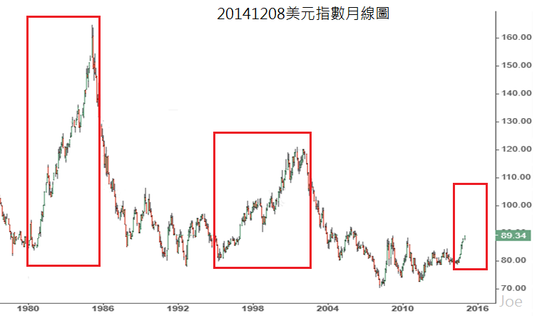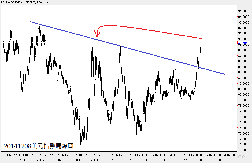 美元指數的價位已經來到近五年來的相對高點,突破藍線以後,後續暫時沒有壓力了,超過2009年初只是時間問題, 我認為美元指數很有機會再向上攀升,直到近十多年來的相對高點,投資人持有美元應該更有耐心。