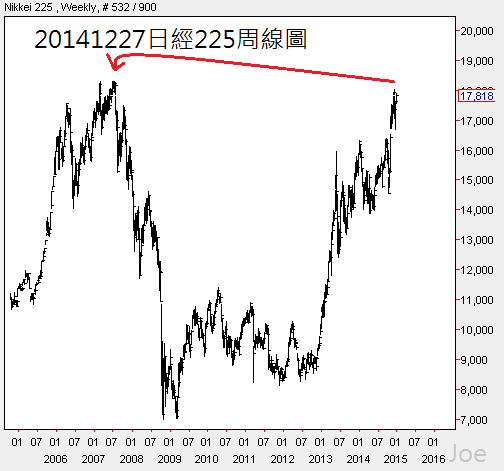 安倍晉三決議QE的決心真的很強烈,日股2015年上漲的機率仍然相當高,突破2007年高點只是時間問題,只要能繼續拉抬通貨膨脹,日本短線經濟仍然相對樂觀,不過投資日股需要顧慮日幣的匯損,不宜當投資主力配置