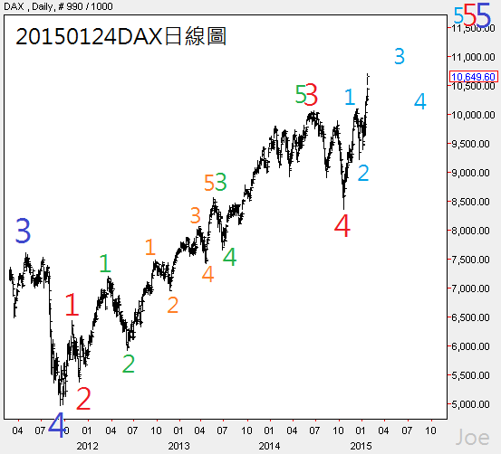 歐元區確定執行量化寬鬆,德國股市DAX價格後續極高機率還會有更高的價位,目前只是無法判斷是在聯準會升息前出現,還是聯準會升息後出現但上漲衍生浪肯定還未跑完,順利的話可以看到12000以上的價位。