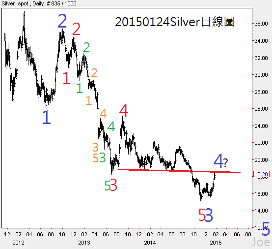 白銀趨勢波下跌C浪還沒有完成,C浪是五浪衍生浪(藍色),紅色則是次級衍生浪,目前白銀日線圖的畫法超過4種,不過都是下跌走勢,所以白銀後市持續下跌的機率相當高,但是下跌過程中跌深反彈是很正常的現象,如果最近白銀價格可以站在紅線之上,並且站上一周以上的時間,讓周線收在紅線之上,那麼紅線就能成為白銀暫時的支撐線,這樣一來,白銀短線就不適合放空,要操作貴金屬的投資人再耐心等等看。