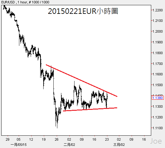歐元區各國財政部長讓紓困基金持續流入希臘,希臘則將遵守紓困條件,希臘紓困計劃延長四個月,但這不影響歐元長線走弱只是歐元跌勢不會一次到位短線跌深反彈隨時會出現目前正在進行三角盤整我認為歐元長線應該滑落至US$1.00以下會出現美元比歐元貴的情況