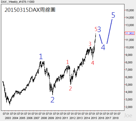 如果歐元繼續在今年走弱的話,這對德國來說,無疑是非常強大的優勢,弱勢歐元和油價,大幅提高德國出口的競爭力和成本,加上歐元區的量化寬鬆未來會有效的提高德國民間消費和企業投資,只要美國和歐盟能維持經濟正成長,那麼德國DAX在美國升息之後,仍然可以有好的表現,周線圖上,波浪結構正好是第五浪的漲勢,我認為2018年以前出現的機率是非常有可能的,比較好的布局點也是美元升息後