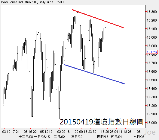 美股最近相當悶,如先前所評估,近期幾乎是原地盤整,雖然我認為NASDAQ很有機會在聯準會升息前創歷史新高,但在突破以前,美股三大指數得盤整一段時間,Dow Jones上週接近紅線,短線上沒衝上去,一轉眼可能又要探底藍線了,短線上較高機率仍然會以區間震盪為主,相當耗時間20150419NASDAQ日線圖
