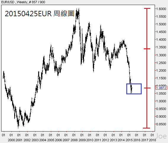 歐元在歐洲央行QE政策後大幅貶值,2008年以來的歐元,明顯在進行2000~2008年的漲勢修正,目前已經來到周線上回檔2/3的位置,這裡要跌破需要一些時間,聯準會正式升息以前,歐元兌美元較高機率會維持在藍色框框內盤整,投資人得耐心等待了