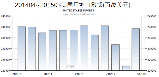 進一步來看,美國進口數據已經恢復到接近2400億美元的水平,圖上可以觀察到,這和201404~201412這段期間的平均值差不多,代表美國消費和進口物資的能力又恢復正常水準了