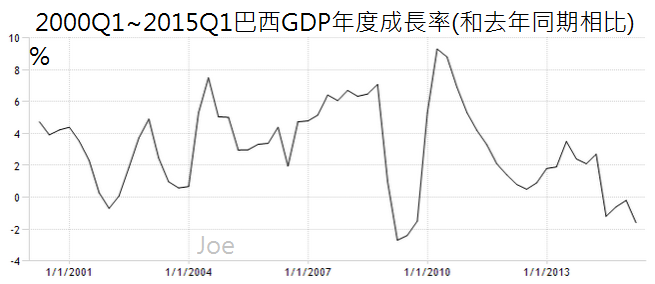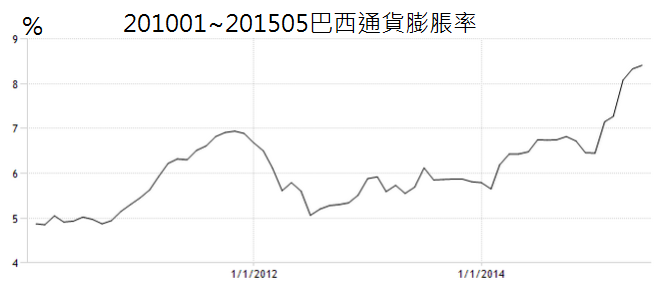 Joe帶讀者回顧一下巴西的實體經濟情況,巴西從2010年以後進入GDP成長率持續下滑的問題,即使是低基期,巴西2015年GDP依然不樂觀,而且巴西里拉的匯率價格對美元持續貶值,和2011年中高點相比,4年貶值50%,結果巴西的通貨膨脹大幅飆升,雖然新興市場的通貨膨脹率高於2%是正常現象,但巴西通貨膨脹率飆升到8%以上,利率急需升息,GDP卻進入負成長,利率需要降息,可以想像,巴西央行的利率工具會完全失效,而巴西央行的決策是把利率提升到接近14%的水準。