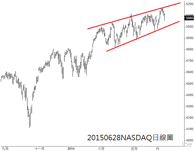 按照目前的總經資訊,美國9月升息的機率最高,NASDAQ仍然是美股三大指數中最有爆發力的大盤,NASDAQ仍然維持在紅線間的穩定成長,第三季的國際事件會相當多,尤其是希臘問題,那群政治人物在幾天的時間內,搞出比我原本預期還要更誇張的劇本,短線上美股投資暫時繼續維持保守態度以維持手上資金為主希臘如果脫離歐元區那麼美國升息被延後的機率可能會大幅攀升但政治的意外無法事先預測建議投資人本周先維持觀望明哲保身