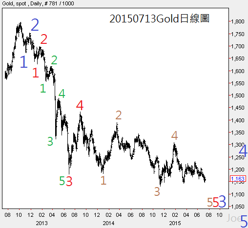 金價在今年下半年的線圖架構,較高機率會進入第五的跌勢,紅色第5浪的衍生第5浪,回檔價位不至於低於US$1000,貴金屬在2015年內仍然不適合作多投資