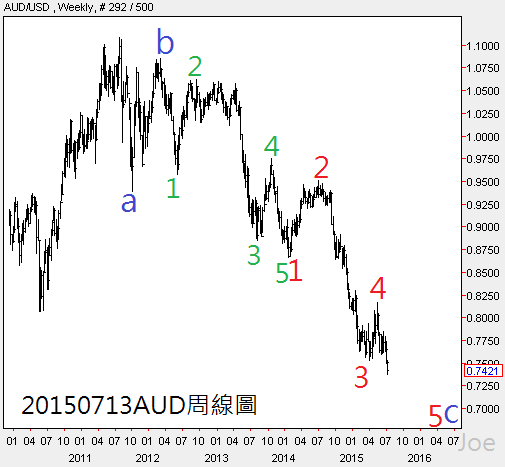 澳幣目前的波浪架構有3種主要畫法,我依然畫出我認為發生機率較高的線圖, 澳幣一年內仍然是弱勢的機率較高,不過跌幅相對於2012~2104年的主跌段,澳幣跌勢會比較緩和,US$0.70目前估算是守得住,大約是NT$21.7左右的價位