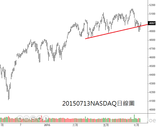 上週NASDAQ一度跌破紅線,但周末收周線的時候已經拉回紅線之上,NASDAQ和S&P500第三季較高機率仍然會是走弱的趨勢,要像6月中以前那樣連續創高的行情,暫時是看不到了,NASDAQ已經如我上半前評估的,在美元升息前,創下歷史新高,只要NASDAQ能夠回檔盤整一季以上的時間,2016年還是會相當有爆發力,美股的長線價值投資仍然是沒有問題的,只是短線需要休息一下,這樣線圖的波浪結構也會更平衡