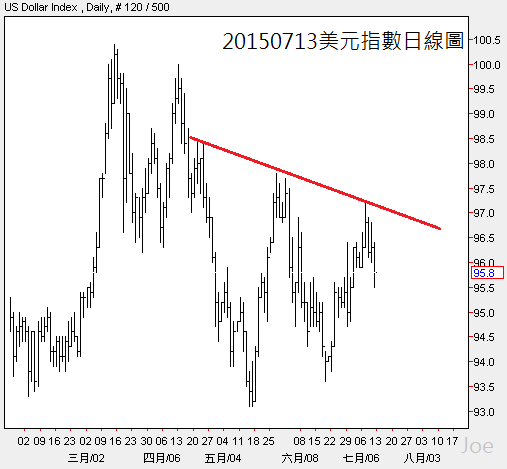 歐元區的政治問題實在很拖時間希臘要不要退出歐元區或者退出後的配套措施如何目前變得很難評估歐元佔美元指數的比重超過60%,歐元走強這部分對美元指數走弱的影響相對較大上週美元指數並沒有順利突破紅線,5月底也有類似的情況,當時突破失敗,美元指數回檔盤整到7月初再測試一次,結果又失敗,我估計美元指數再測試紅線又要一段時間了,投資人耐心等待吧