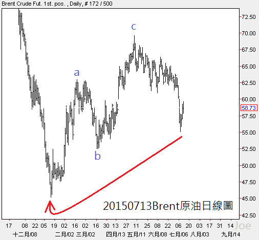 從日線圖的波浪結構來看,Brent原油在今年上半年發展出三浪結構,我暫時當作是a-b-c,這種走勢發生的機率較高,整體來看,2014年7月以前是主浪1~5,而7月以後到現在一年的時間是趨勢波,第三季國際油價在國際接二連三的利空事件下,還是蠻有機會出現跌破紅線的更低點,2014年的油價暴跌差不多也是年中開始出現,今年出現類似走勢的話,機率是相當高的,目前全球原油生產持續在增加,中東和北美依然擴大增產,從供需平衡的角度來看,油價繼續走弱相當並不意外