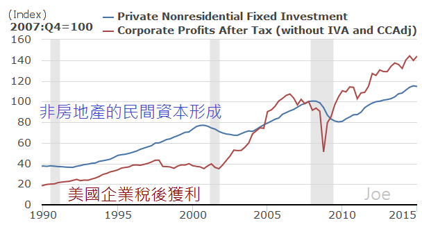 1990~2015美國企業稅後獲利和非房地產資本形成 2015-07-14 joe 新聞時事看法(News、Opinion) 0 從美國資本市場最近20多年的發展歷史,對照美國非房地產類型的民間固定資本形成,加上企業稅後獲利(還沒有經過庫存價格與資本消耗折舊調整)的相對演變,2016~2017年的NASDAQ,如果沒有大規模天災人禍的話,極高機率會有相當驚人的表現
