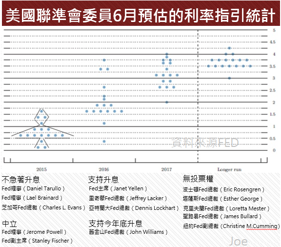 今晚02:00聯準會利率會議會宣布是否升息,從6月到現在的聯準會官員談話或言論傾向,我認為今晚美元升息的機率相當低,Yellen 實際能掌握同意升息的官員票數,理論上不會過半,但下次會議應該可以票數過半,根據17位委員上次會議的投票結果,支持美元利率維持在0.5~1.0%的 官員有10票最多,所以今年升息到0.5%以上的機率極高。