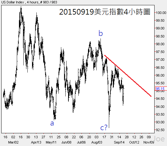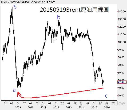 目前全球原油供給成長仍然是大於需求成長預期,半年內的趨勢我仍然看空,加上聯準會上週維持利率不變,油價並沒有短期的利多效益,我認為今年內,Brent原油有蠻高機率可以出現跌破2008年底的a浪低點,油價短期內仍然會維持相對弱勢