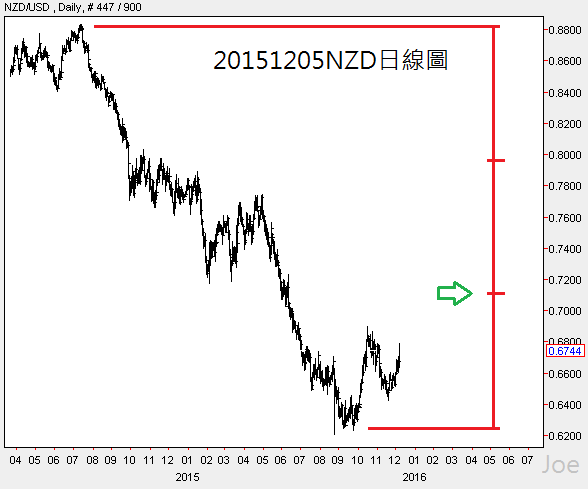 紐幣過去一年多來,價格至少跌了30%,不過隨著美元升息的利空出盡,我預估非美元貨幣可以暫時喘口氣,出現一波較大的反彈行情,從日線圖來判斷,我認為紐幣較高機率可以突破US$.070,甚至US$0.71以上的價位,能不能攀升的更高,那就得看價格到US$0.710以上的線圖狀態,屆時再來判斷