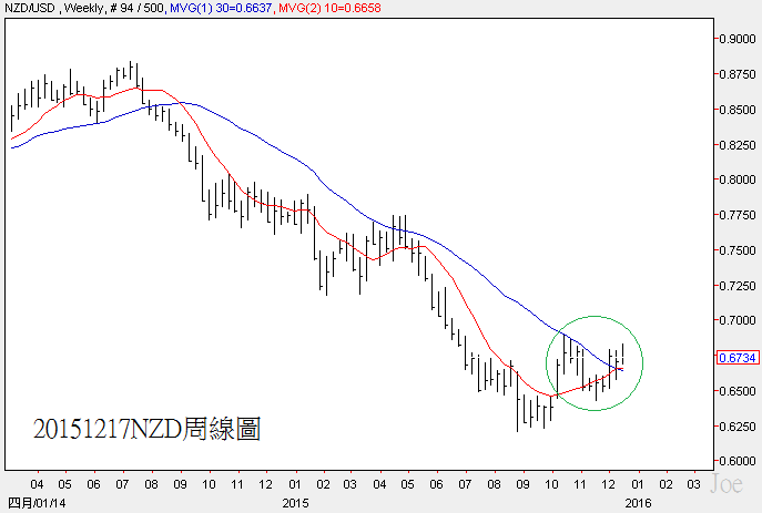 紐西蘭幣正在發展一個底部型態,周線的長(30、藍)短(10、紅)均線,已經出現交叉,最近一周的價位都維持在交叉點之上,收周線如果能繼續維持在這個價格之上,那麼紐幣的漲勢,月底到下個月的時間裡,出現的機率相當高,目標可能落在US$0.720以上