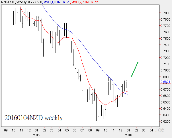 紐幣周線圖上的長(30、藍)短(10、紅)均線已經交叉反轉短線上紐幣繼續維持反彈行情的機率較高大約是我標示綠線的發展這是跌深反彈行情