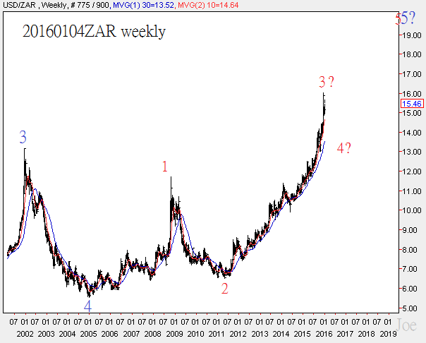 南非幣周線正在進行對美元的長線貶值趨勢,用長遠的發展來看,南非幣很可能會出現USD/ZAR在20以上的價位,雖然南非幣在2016年可能出現暫時性的跌深反彈調整,不過波段低點相當難抓,仍然不建議進場抓反彈,長線套牢的機率仍然相當高