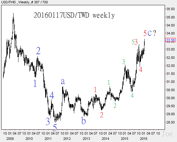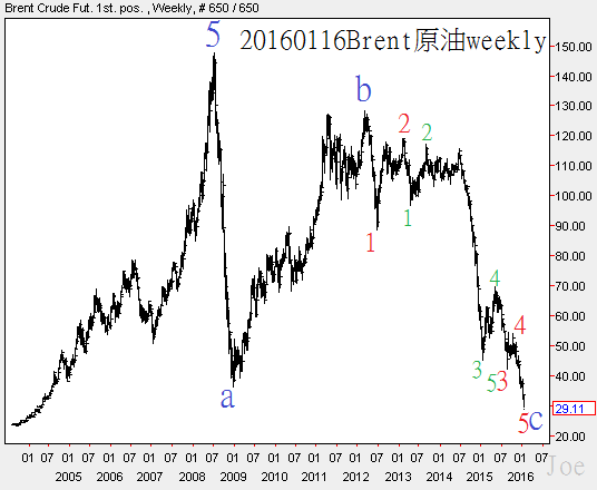 國際油價的C浪跌得相當徹底,再往下的跌勢最多就29美元了,再多點耐心等等吧,我預估油價和國際股市很高機率會同時止跌,甚至可能帶動新興市場貨幣出現跌深反彈的一波行情,但時間點估不到,只能繼續耐心等了