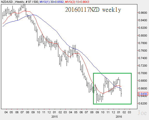 紐幣周線圖上的價格再度跌破長(30、藍)短(10、紅)均線交叉點而且周線收盤價格也沒有拉回長(30、藍)均線之上,延續我上周的說法,紐幣和澳幣的長線仍然是偏空的格局,投資人只能在短線可能的跌深反彈分批出場,仍然不建議進場做多,一周的時間過後,更能確定這個長線空頭的格局還未走完,雖然短線可能維持盤整格局,但這樣的趨勢仍然不利於多頭的展開