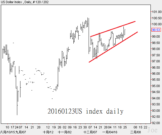 我的疑問是: 雖然美元指數周線上看似一個M頭, 但可否也能看成一個W底: 去年5-7月是左底, 9-11月是右底, 而12月至今是突破並回測頸線並有支撐呢?