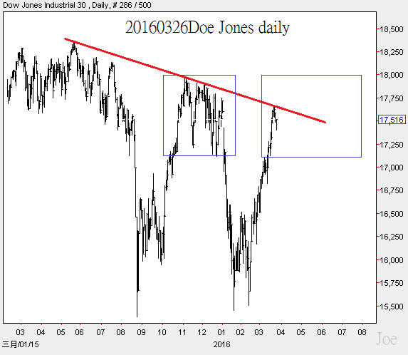 Dow Jones周線的底部型態差一點才能完成,那條紅線不容易突破,需要一些時間了,我估計美股較高機率會在右邊藍色框框之間震盪,投資人可以暫時以這段價差作區間操作,目前只能一手現金,一手現貨,耐心等進一步發展了