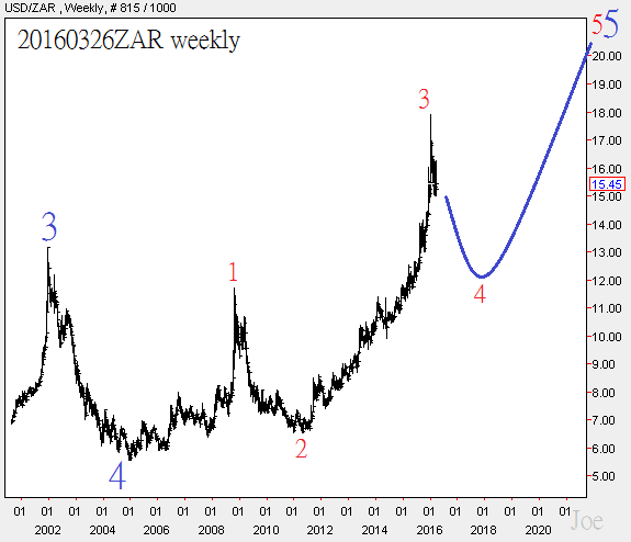 南非幣周線呈現跌勢的看法並沒有改變,但目前很可能在進行主浪的衍生浪,我圖上標示的是紅色第4浪,USD/ZAR很可能再度碰到紅色1浪的高點位置,如果這個價格順利在今年出現,那會是適合脫手ZAR的好價位,這次的ZAR分析,比我先前分析的更樂觀些