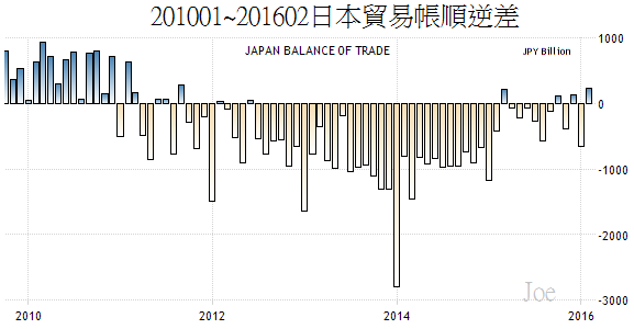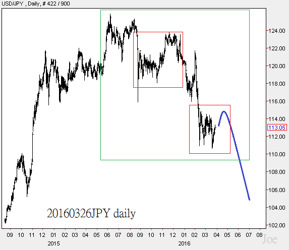 低油價改變了日本的貿易逆差趨勢這對於日幣持續維持貶值是較不利的,日本央行在上半年必須推出更強而有力的寬鬆貨幣政策,這樣才能讓流入日本的資金縮小,同時讓國際熱錢向外流出日本,進行商品套利,最好是負利率加上擴大與延長QE,不過這要等4月下旬以後才能推出了20160326JPY daily