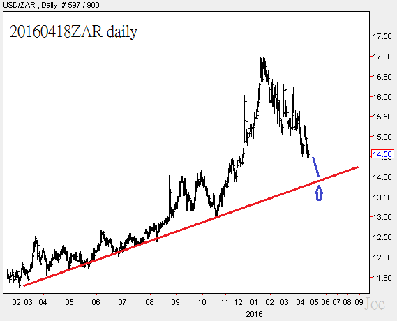 3. 站長您好:依您上面南非幣的線圖,請問您認為南非幣只會漲到14左右,就不會再漲了嗎?南非幣會不會再繼續挑戰周線圖上的上升支撐線(大約到13左右)呢?可是您在3月26日南非幣周線圖不是看到12嗎?