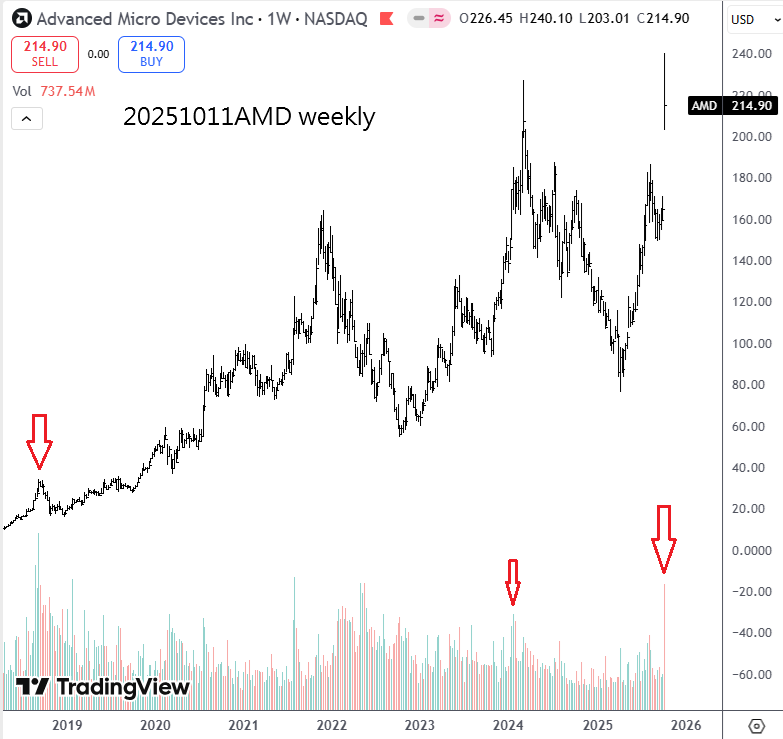 這波AI熱潮,AMD和NVDA與TSM都是很熱門的企業,其中AMD暫時出現波段爆大量的情況,讀者可以參考我過去提到爆大量的經驗作參考