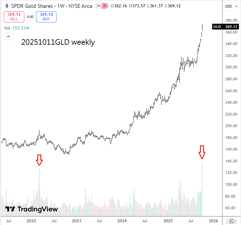 追蹤黃金的GLD ETF,這周也爆大量了,誰在拋,誰在買,一些央行門買了不少,但這麼高的價位,爆量換手繼續漲的機率高?還是主力倒貨的機率高?